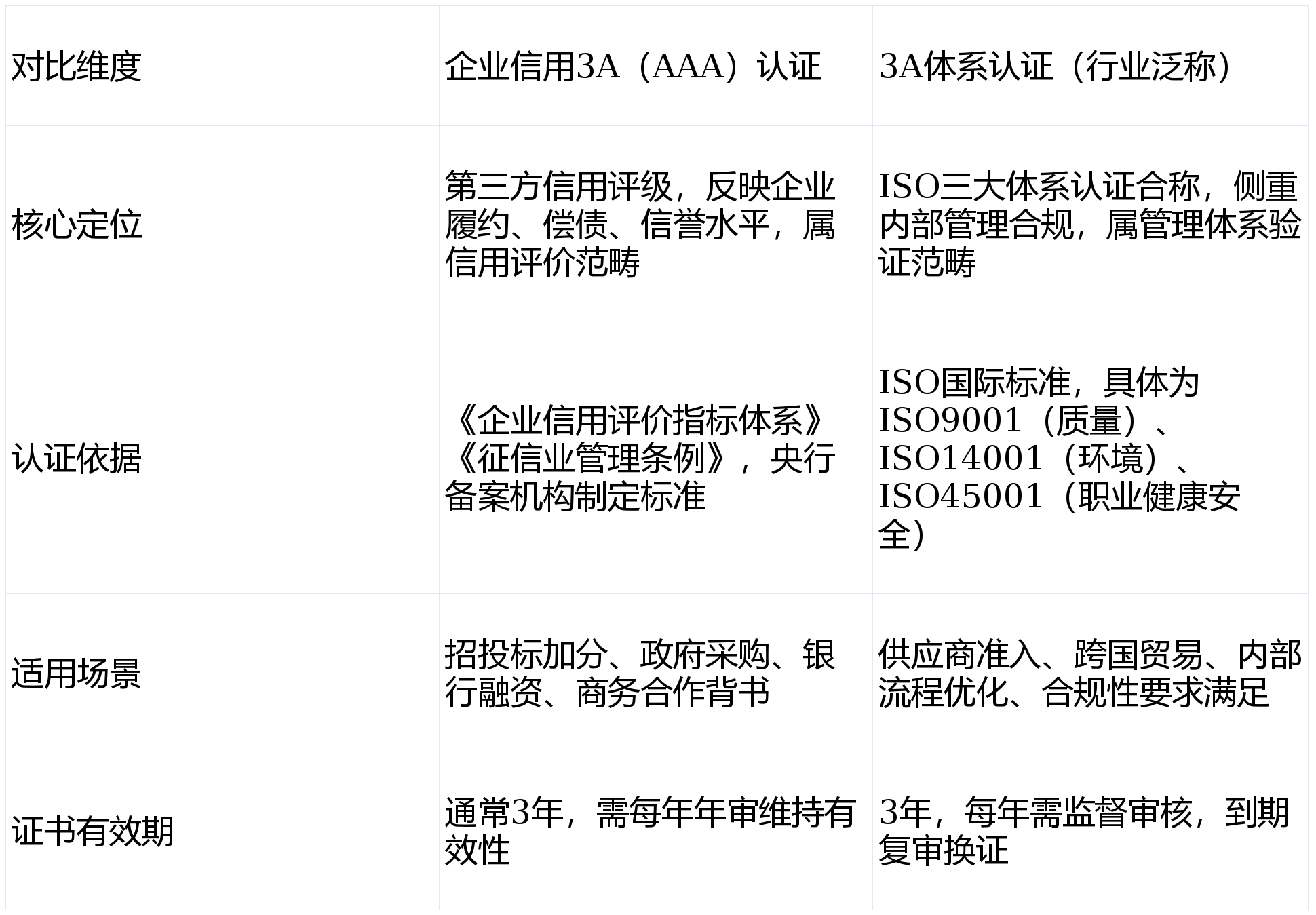 商业场景中提及的“3A认证”并非单一标准认证,核心分为两类——企业信用3A(AAA)认证(主流场景适用)和三体系认证(行业泛称),二者性质、用途差异显著。其中,信用3A认证是企业信用状况的最高评级证明,是招投标、融资的“信用硬通货”;3体系认证则是三种管理体系认证的合称,侧重内部管理合规。